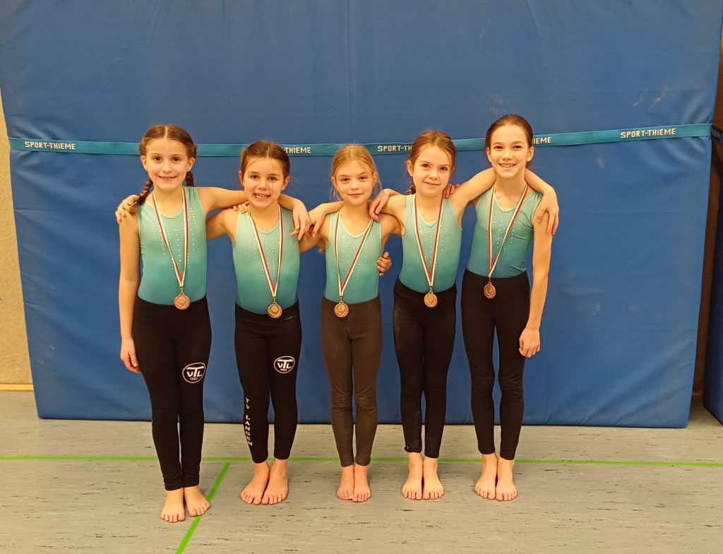 Im zweiten Durchgang des Tages turnten Mia Lepen, Fiona Löffler, Matilda Oberle, Lilli Schulze und Livia Viktorova im Wettkampf 2, P3/4; Sprung der P5 der Jahrgänge 2015 und jünger. Krankheitsbedingt mussten die Fünf auf Vega Munoz Garcia verzichten. Nichtsdestotrotz konnte das Team im Vergleich zur ersten Runde sechs Punkte mehr ertrugen, die im Endeffekt ausschlaggebend für den Sprung auf das Treppchen waren. Die Mädchen, die teilweise erst seit den Sommerferien turnen, sicherten sich die Bronzemedaille unter den zehn gestarteten Teams.